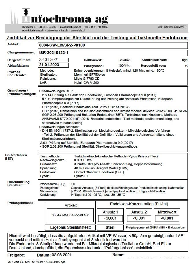 Neben der internen 100 %-igen Sichtkontrolle des Endproduktes auf optische Defekte werden von jeder Charge Proben an ein externes akkreditiertes Mikrobiologisches Labor gesandt. Dieses hat den Auftrag, die Analyse auf Sterilität und den BET (Bakterien-Endotoxin-Test) durchzuführen.