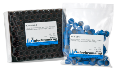 Flacon de stockage standard, verre borosilicaté transparent (H) ou ambré (D), et bouchon à vis fermé, revêtu de PTFE.