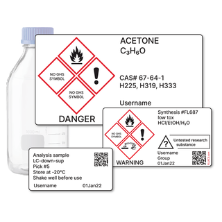 Lösemittelbeständige Etiketten mit Gefahrenpiktogrammen in Sekundenschnelle. GHS/CLP-konform für ein sicheres Labor.